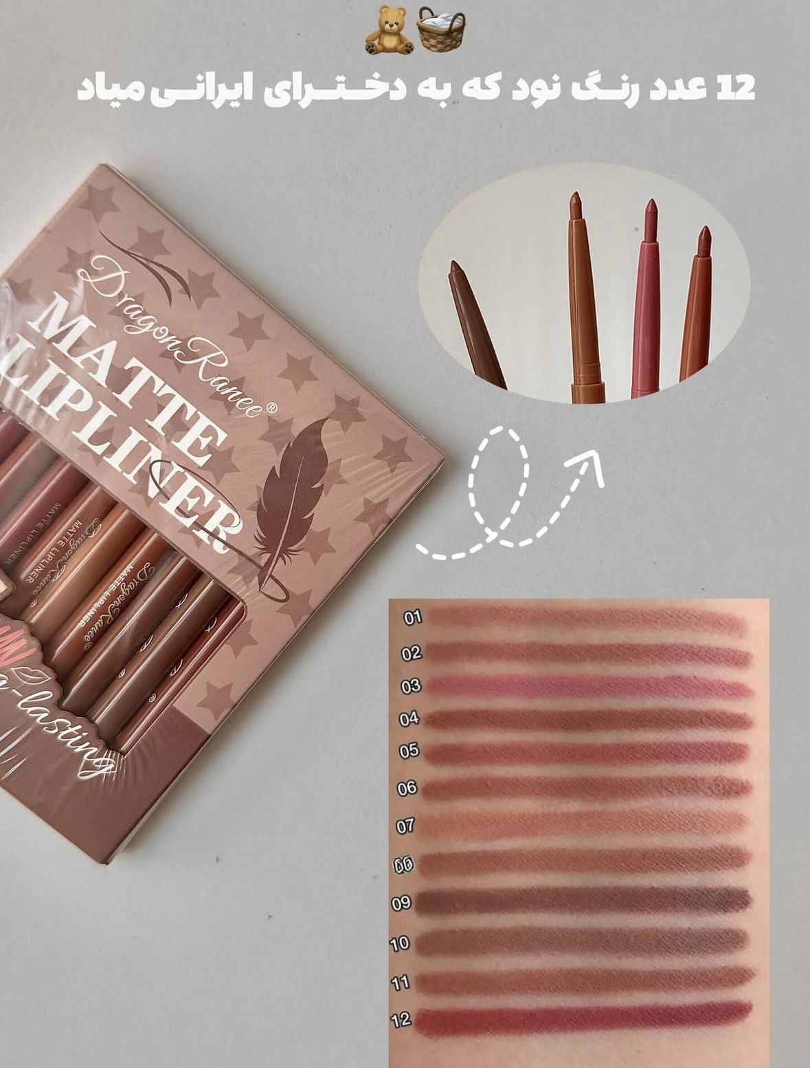 خط لب پیچی دراگون رانی Dragon Ranee شامل 12 رنگ فوق العاده کاربردی دارای پکیج شیک و جذاب فوق العاده باکیفیت، نرم و روان بافت یکدست و مخملی و مات بدون پوسته شدن و ترک خوردن به صورت پیچی ساخت چین وزن: 12 * 1 گرم